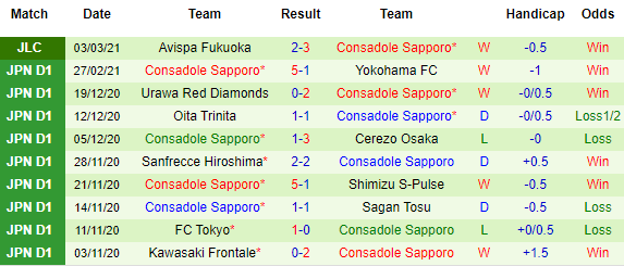 + Thống kê 10 trận gần nhất của Consadole Sapporo
