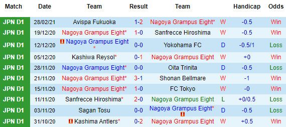+ Thống kê 10 trận gần nhất của Nagoya Grampus