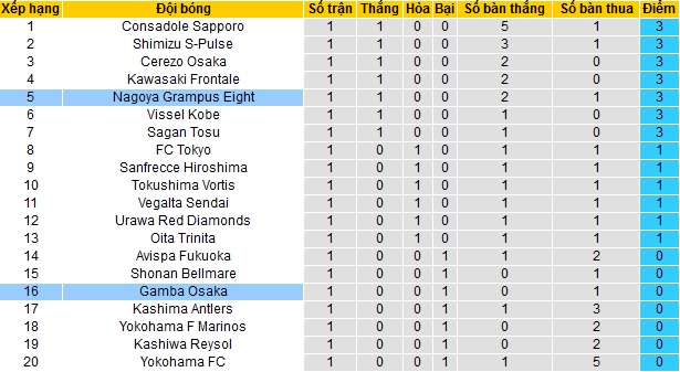 Bảng xếp hạng giải VĐQG Nhật Bản trước vòng 2