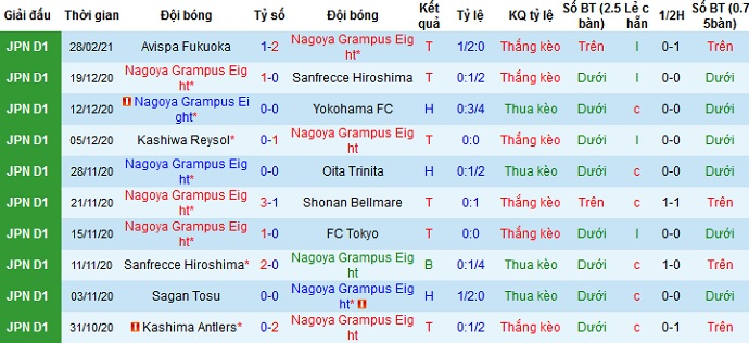 + Thống kê 10 trận gần nhất của Nagoya Grampus