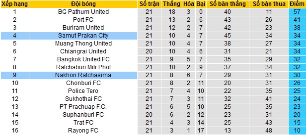 Bảng xếp hạng giải VĐQG Thái Lan trước vòng 22
