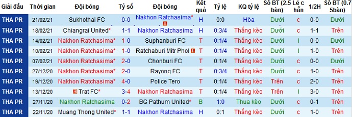Mặc dù lần gần nhất trên sân nhà Nakhon Ratchasima đã để thua trước đối thủ nhưng 3 lần trước đó Nakhon Ratchasima đều giành chiến thắng. Ngoài ra đội chủ nhà đang có phong độ rất cao tại đây nên có lẽ chọn cửa trên sẽ là sự lựa chọn hợp lý.