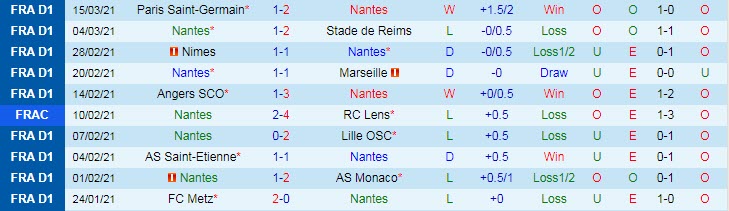 + Thống kê 10 trận gần nhất của Nantes
