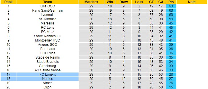Ở một diễn biến khác, họ cũng chỉ hơn đội xếp sau Nimes (đội bóng xuống hạng trực tiếp) đúng 1 điểm. Đây cũng là khoảng cách của Nantes với đội an toàn Lorient.