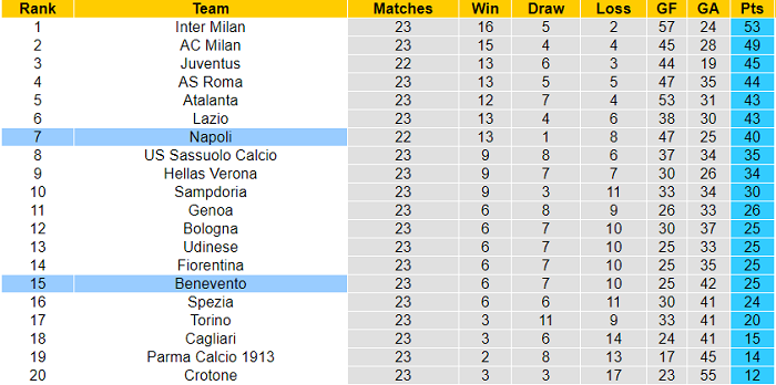 Bất chấp việc thành tích có phần giảm sút, đánh bại Benevento là điều không hề đơn giản ở thời điểm hiện tại. Bằng chứng: họ bất bại tới 4/5 vòng gần nhất. Ngay cả AS Roma cũng không thể giành 3 điểm khi so tài cùng các cầu thủ do HLV Filippo Inzaghi dẫn dắt: hòa 0-0.