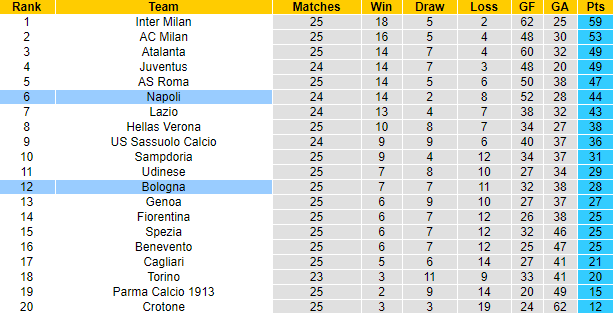 Tại Serie A 2020/21, Napoli đang có nhiều hơn Bologna 16 điểm dù đá ít hơn 1 trận. Theo đó, Napoli đang có 44 điểm sau 24 trận, xếp thứ 6 trên bảng xếp hạng. Trong khi đó Bologna có 28 điểm sau 25 trận, xếp ở vị trí thứ 12.