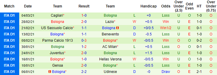 + Thống kê 10 trận gần nhất của Bologna