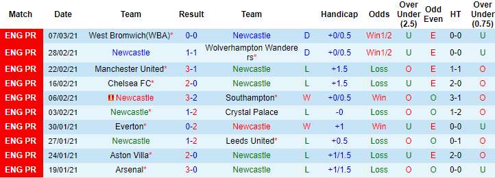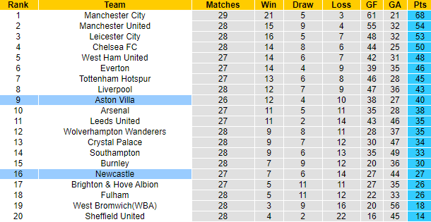 Newcastle bất bại cả 11 lần tiếp đón Aston Villa gần đây trên sân nhà với 7 chiến thắng và 4 trận hòa. Tuy nhiên ở lần tái đấu sắp tới, Newcastle sớm bị nghi ngờ vào khả năng thoát thua. Sau 27 vòng đấu tại Premier League 2020/21, Chích chòe mới giành được 27 điểm, xếp ở vị trí thứ 17 trên bảng xếp hạng. Trên sân nhà, 5 trận gần đây Newcastle để mất điểm 4 trận với 3 thất bại và 1 trận hòa.