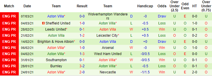 + Thống kê 10 trận gần nhất của Aston Villa