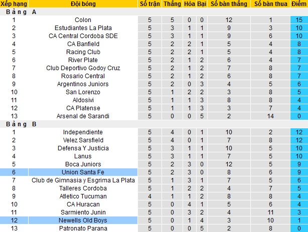 Bảng xếp hạng giải VĐQG Argentina trước vòng 6