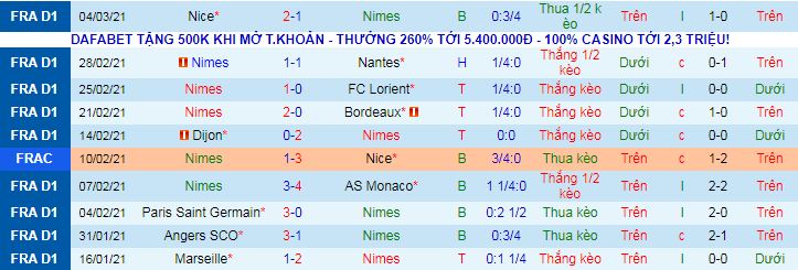 Trước khi bước vào trận đấu này, Nimes có 7 trận thắng, 4 trận hòa và nhận 17 trận thua sau 28 vòng đấu. Hiện tại, họ đứng ở vị trí 18 – chỉ còn kém nhóm an toàn đúng 2 điểm. Sau chuỗi trận ấn tượng với 3 chiến thắng liên tiếp cùng 1 trận hòa, Nimes đã không thể tiếp tục tạo nên bất ngờ khi để thua sát nút 1-2 trên sân của Nice ở vòng đấu vừa qua.
