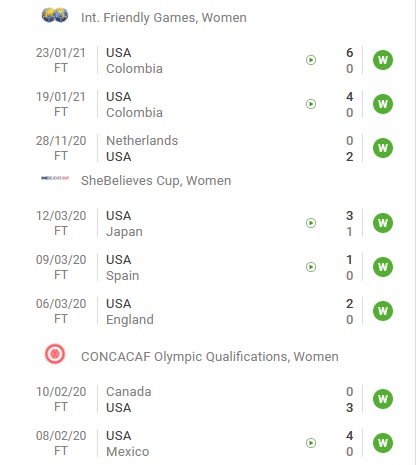 Sau giai đoạn tạm nghỉ từ giữa tháng 3 năm ngoái, ĐT Nữ Mỹ đã quay trở lại thi đấu từ cuối tháng 11 và đã kịp có 3 trận giao hữu. ĐT Nữ Mỹ vẫn đang duy trì được phong độ ổn định khi toàn thắng trong cả 3 trận, ghi tới 12 bàn thắng và giữ sạch lưới trước các đối thủ lần lượt là Nữ Hà Lan và 2 trận trước Nữ Colombia.