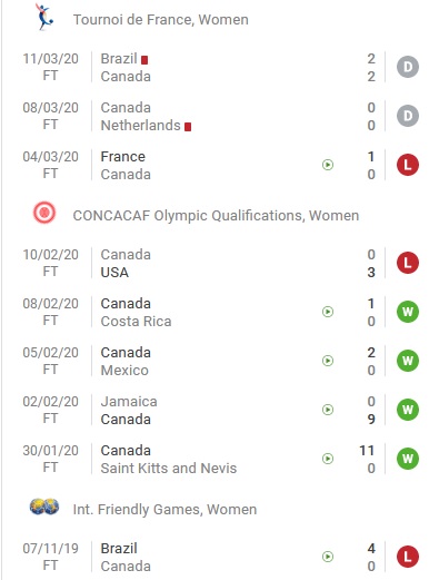Trong khi đó Nữ Canada vẫn chưa thi đấu trận nào kể từ tháng 3 năm ngoái. Ở 5 trận đấu cuối cùng Nữ Canada chỉ có được 1 trận thắng, hòa 2 và để thua 2 trận.