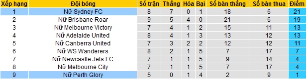 Nữ Perth Glory hiện vẫn đang vật lộn ở vị trí bét bảng xếp hạng của giải vô địch quốc gia nữ Úc. Mặc dù mới thi đấu 5 trận, kém các đội khác từ 2 đến 3 trận nhưng Nữ Perth Glory mới chỉ có được 1 điểm, đang kém 2 đội đứng ngay trên 3 điểm.