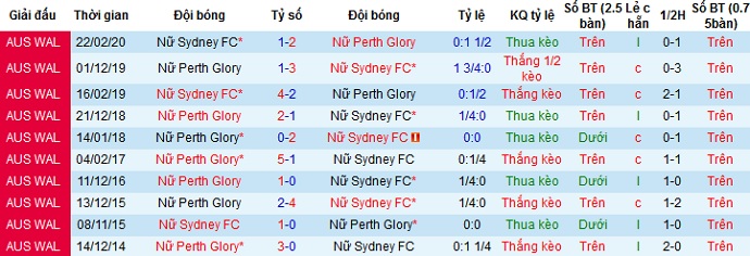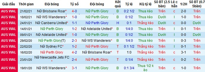 Thế nhưng trong 10 lần đối đầu trước đó Nữ Perth Glory đang có thành tích ngang bằng với đối thủ khi thắng 5 và để thua 5. Không những thế trong cả 5 lần thua chưa lần nào Nữ Perth Glory thua với cách biệt quá 2 bàn. Thế nên chọn cửa dưới ở trận đấu này vẫn an toàn và hoàn toàn có cơ sở.