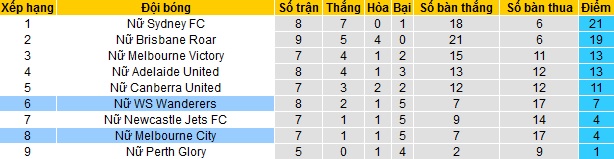 Sau 8 vòng đấu tại giải vô địch quốc gia nữ Úc, Nữ Western Sydney Wanderers vẫn chỉ đang đứng ở vị trí thứ 6 trên bảng xếp hạng với 7 điểm. Hiện tại khoảng cách của Nữ WS Wanderers với các đội Top 4 hiện đã lên tới 6 điểm.