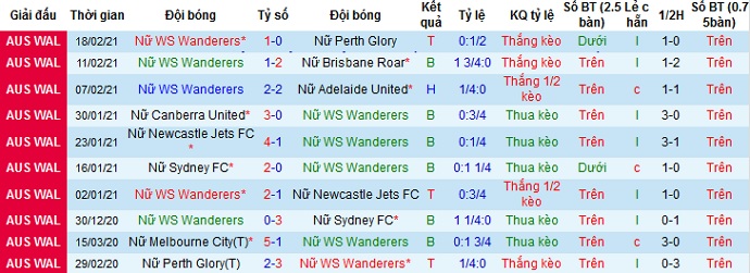 Ở 5 trận đấu gần đây Nữ WS Wanderers chỉ có được 1 trận thắng, 1 trận hòa và để thua 3 trận. Tuy nhiên các trận có điểm của Nữ WS Wanderers đều diễn ra trên sân nhà, ở 5 trận đấu gần nhất tại đây đội bóng có được 2 trận thắng, 1 trận hòa và để thua 2 trận.