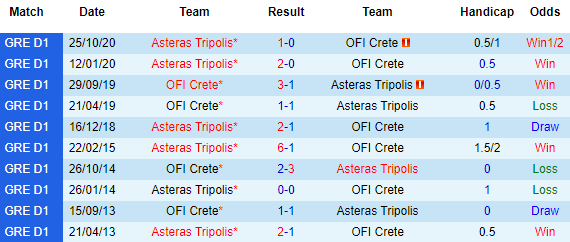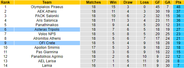 Lẽ dĩ nhiên là điểm số, thứ hạng của đôi bên cũng tương đồng cùng màn trình diễn thời gian qua của 2 đội. OFI Creta thi đấu thất thường và thất bại 3 trận liên tiếp gần đây. Trong khi đó, dẫu không quá bùng nổ nhưng Asteras Tripoli vẫn duy trì được sự ổn định với việc toàn thắng 3 vòng mới nhất.