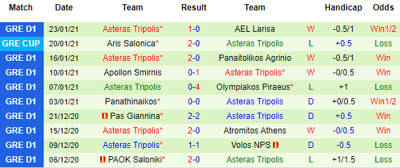 + Thống kê 10 trận gần nhất của Asteras Tripoli