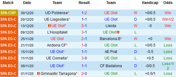 Olot đã trải qua 9 vòng đầu tiên nhưng chỉ có 9 điểm và đang đứng thứ 10. Hy vọng về khả năng lên chơi tại giải Hạng 2 Tây Ban Nha rất xa vời dành cho Olot. Ở vòng 1 Cúp Nhà Vua, Olot vượt qua đối thủ cùng hạng khác là Poblense với tỷ số 2-1.