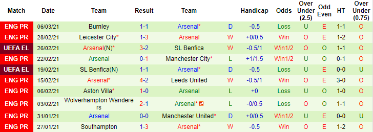 + Thống kê 10 trận gần nhất của Arsenal