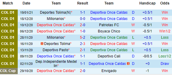 + Thống kê 10 trận gần nhất của Once Caldas