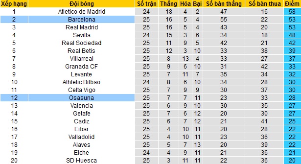 Sau 25 vòng đấu tại giải vô địch quốc gia Tây Ban Nha La Liga, Osasuna đang có được 28 điểm và đứng thứ 13 trên bảng xếp hạng. Hiện tại Osasuna đang có nhiều hơn nhóm các đội cầm đèn đỏ 6 điểm nhưng cũng kém nhóm các đội có suất dự cúp châu Âu tới 11 điểm.