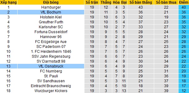 Trong khi đó Bochum vẫn đang đứng thứ nhì trên bảng xếp hạng với 36 điểm sau 19 vòng đấu. Hiện tại Bochum đang có cùng bằng điểm với đội thứ ba Holstein Kiel nhưng hơn về hiệu số bàn thắng và đang kém đội đầu bảng Hamburger 4 điểm nhưng thi đấu ít hơn 1 trận. Dù sao đây cũng là thành tích khá tiến bộ của đội bóng nếu so với vị trí thứ 8 trong mùa giải trước.
