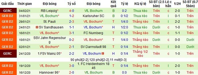 + Thống kê 10 trận gần nhất của Bochum