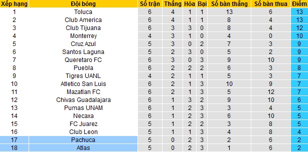 Bảng xếp hạng giải VĐQG Mexico vòng 6