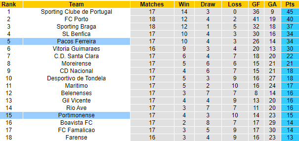 Nếu như Pacos de Ferreira đứng thứ 5 và sáng cửa giành vé dự Cúp châu Âu thì Portimonense lại ngấp nghé khu vực cầm đèn đỏ. Pacos de Ferreira chỉ kém Braga và Benfica phía trên có 3 điểm, trong khi vẫn còn trận cầu với Portimonense này, nếu thắng thì Pacos sẽ bắt kịp 2 đối thủ trên.