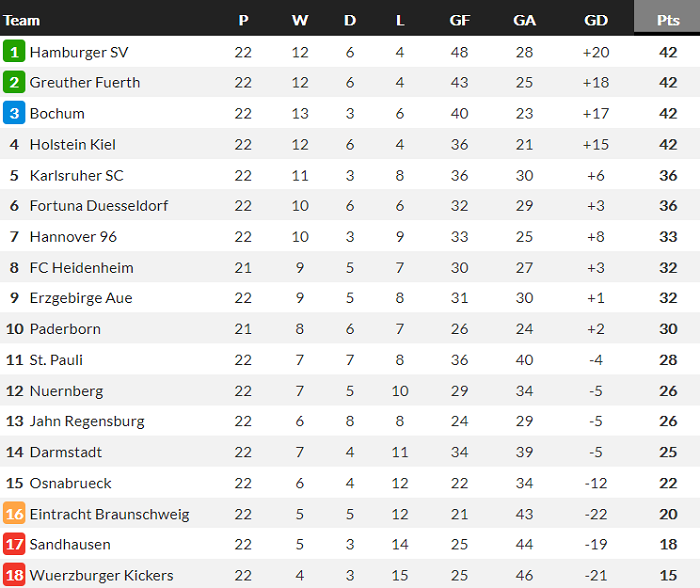 Bảng xếp hạng Bundesliga 2 mới nhất