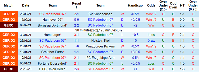 - Thống kê 10 trận gần nhất của Paderborn