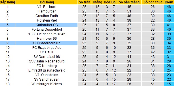 Trong khi đó Karlsruher vẫn đang duy trì được vị trí thứ 5 trên bảng xếp hạng. Tuy nhiên với 41 điểm có được sau 25 vòng đấu, Karlsruher đang kém cả 3 đội đứng ngay trên 5 điểm đồng thời bị đội bóng thứ 6 Fortuna Dusseldorf bám sát khi khoảng cách chỉ là 1 điểm.