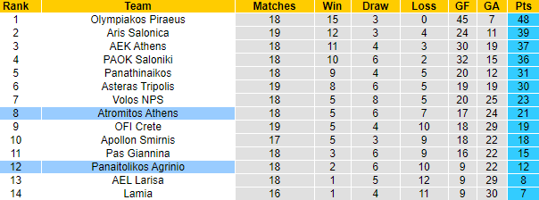 Cả Panetolikos và Atromitos đều không phải những cái tên chất lượng ở Hy Lạp, và vào thời điểm này, vị trí của đôi bên đã nói lên điều đó. Panetolikos đứng thứ 12/14 đội tham dự giải đấu còn Atromitos khá hơn đôi chút với vị trí thứ 8.
