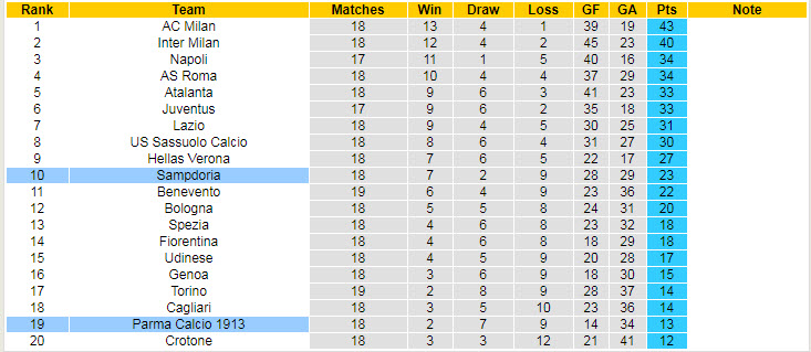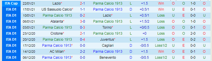 Parma bước vào trận đấu cuối cùng của lượt đi giải VĐQG Italia 2020/21 với bộ mặt bạc nhược. Cụ thể, đội quân của HLV D'Aversa vừa trải qua chuỗi 9 trận liên tiếp không biết mùi thắng lợi tại giải đấu số 1 xứ sở mỳ ống – hòa 4 và thua 5 trận. Cách đây ít ngày, họ nhận thêm thất bại với tỷ số 1-2 trước Lazio tại cúp QG Italia.