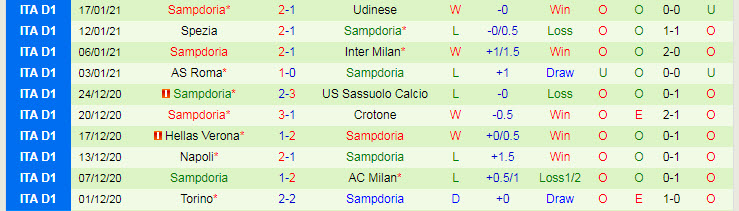 + Thống kê 10 trận gần nhất của Sampdoria