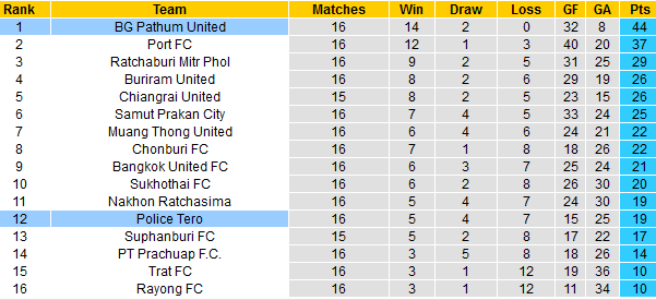 Sau 16 vòng đầu tiên, Pathum United là đội duy nhất giữ thành tích bất bại với 14 chiến thắng và chỉ 2 lần chia điểm. Pathum United bỏ xa đội đứng nhì bảng tới 7 điểm là thành tích đáng hy vọng. Trong khi đó, Police Toro vẫn nhạt nhòa khi chỉ đứng thứ 12 với phong độ tệ hại gần đây.