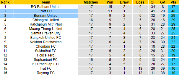 Ngay cả vị trí thứ 2 cũng không còn khả thi với Buriram bởi khoảng cách giữa họ và đối thủ đang sở hữu thứ hạng này cũng lên đến 11 điểm. Kẻ đang đứng thứ 2 trên BXH lại chính là Port, đối thủ của Buriram ở trận này. Làm khách trên sân của đội đang xếp trên mình, khó khăn với Buriram là điều đã được dự báo từ trước.