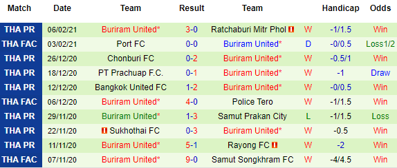 Trong vài năm trở lại đây Buriram là thế lực lớn nhất của bóng đá Thái Lan. CLB này đang dẫn đầu về số lần vô địch Thai-League. Tuy vậy thì cơ hội cho Buriram làm được điều đó ở mùa giải năm nay là hoàn toàn xa vời. Hiện tại họ kém đội đầu bảng Pathum United tới 18 điểm, con số quá lớn.