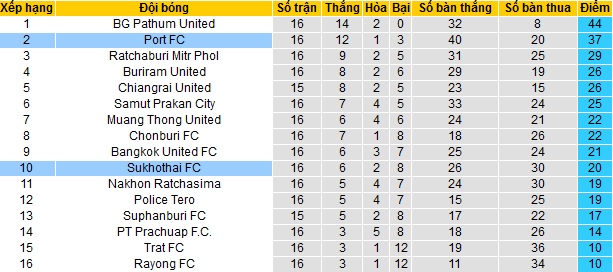 Trong khi đó Sukhothai FC chỉ đứng thứ 10 trên bảng xếp hạng với 20 điểm cũng sau 16 vòng đấu. Tuy đang bị các đội dẫn đầu bỏ rất xa nhưng Sukhothai FC cũng có được khoảng cách khá an toàn với các đội trong nhóm cầm đèn đỏ cuối bảng khi có nhiều hơn 6 điểm.