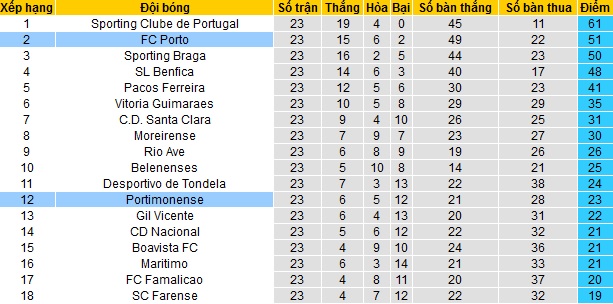 Trong khi đó FC Porto vẫn đang duy trì được vị trí thứ nhì trên bảng xếp hạng với 51 điểm cũng sau 23 vòng đấu. Thế nhưng khoảng cách với đội đầu bảng Sporting hiện đã lên tới 10 điểm, trong FC Porto vẫn đang bị đội thứ ba là Braga bám rất sát khi chỉ hơn kém có đúng 1 điểm.