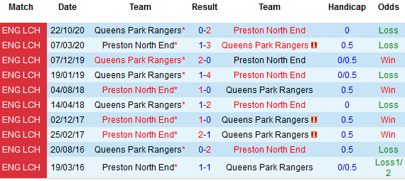+ Soi tỷ lệ kèo châu Á: Trong 10 trận gần nhất, Preston North End không thắng kèo châu Á tới 8 trận.Ngược lại, QPR thắng tỷ lệ 8 trong 9 trận gần nhất của họ.