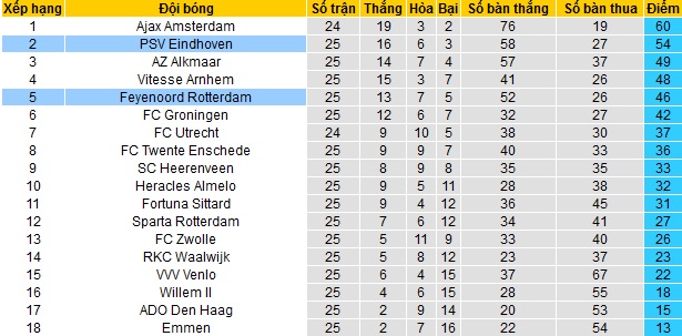 Trong khi đó Feyenoord vẫn đang nằm trong nhóm các đội có suất dự play-off khi đứng ở vị trí thứ 5 của bảng xếp hạng. Tuy nhiên với 46 điển có được cũng sau 25 vòng đấu, Feyenoord cũng rất khó để có thể lọt vào Top 3 khi khoảng cách hiện giờ cũng đang là 6 điểm.