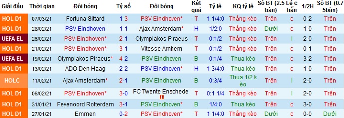 + Thống kê 10 trận gần nhất của PSV Eindhoven