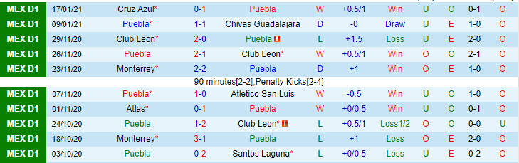 + Thống kê 10 trận gần nhất của Puebla
