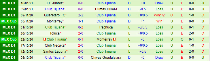 + Thống kê 10 trận gần nhất của Club Tijuana