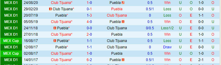 + Lịch sử đối đầu Puebla vs Club Tijuana
