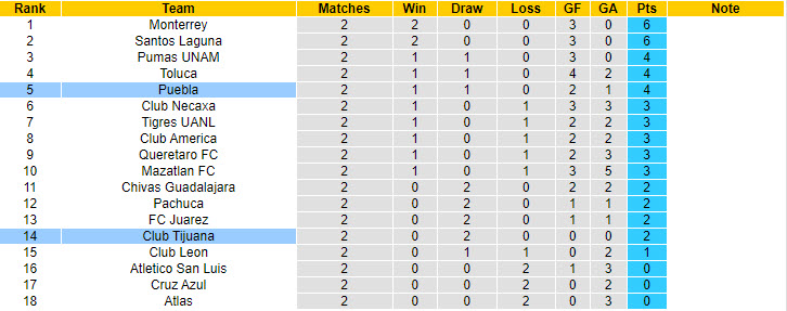 Phong độ và thống kê đối đầu Puebla - Club Tijuana gần đây: