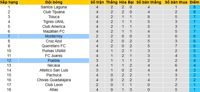 Bảng xếp hạng giải VĐQG Mexico trước vòng 5